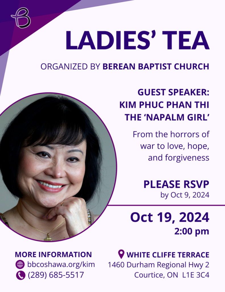 On Saturday, October 19, 2024, we will be hosting a ladies’ luncheon with guest speaker Kim Phuc Phan Thi who will share her story from the horrors of war to love, hope, and forgiveness. If you or someone you know is struggling with anger or bitterness, this is a great opportunity to learn from someone who overcame life-threatening torment and sorrow achieving one of the most incredible victories of our time.